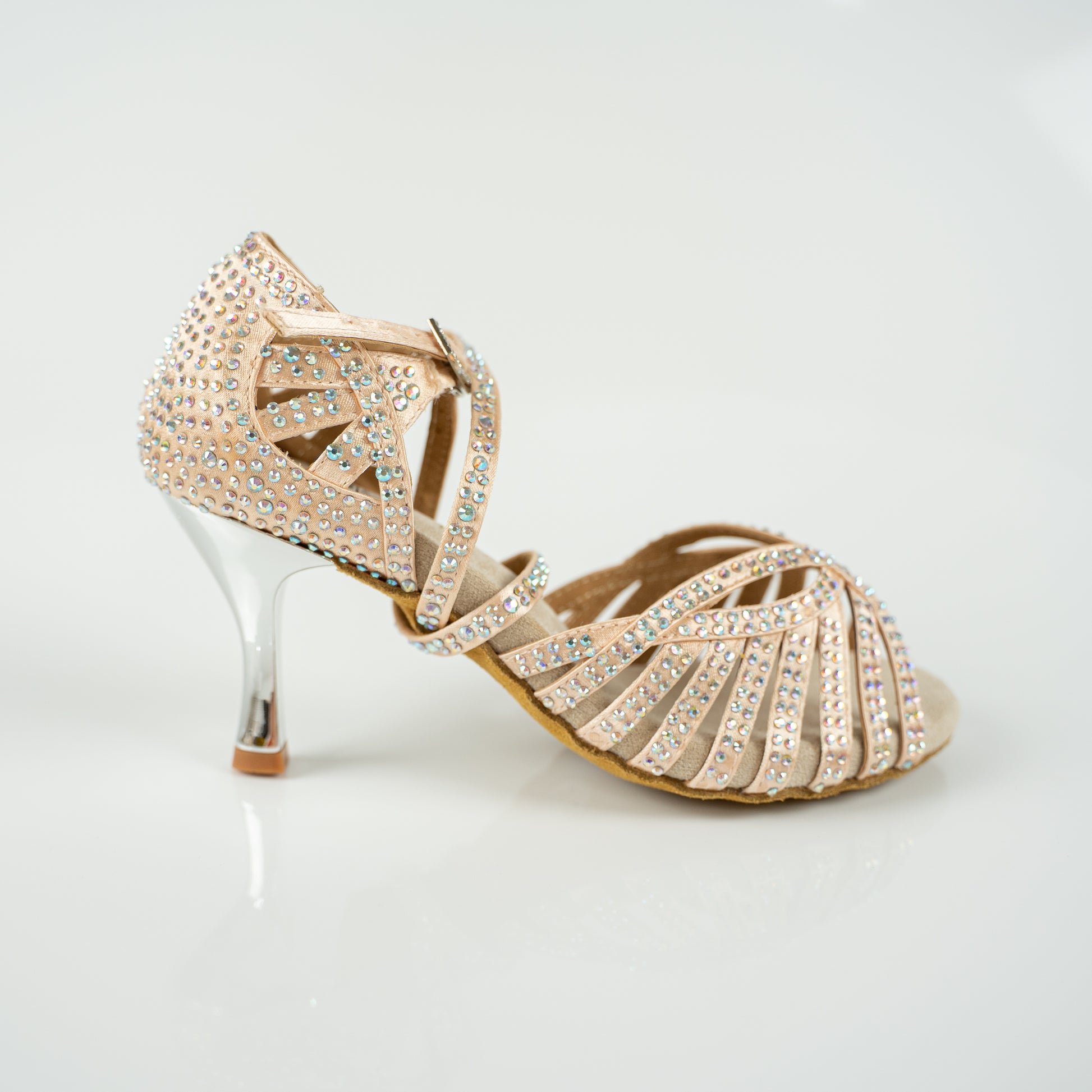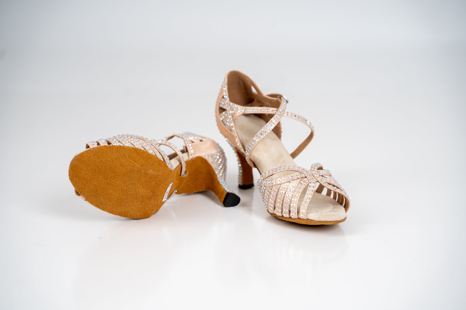Classic nude Abelia dance shoes with full rhinestones give extra glam on the dance floor. Featuring crisscross ankle straps, medium width, and rhinestone buckle closure.